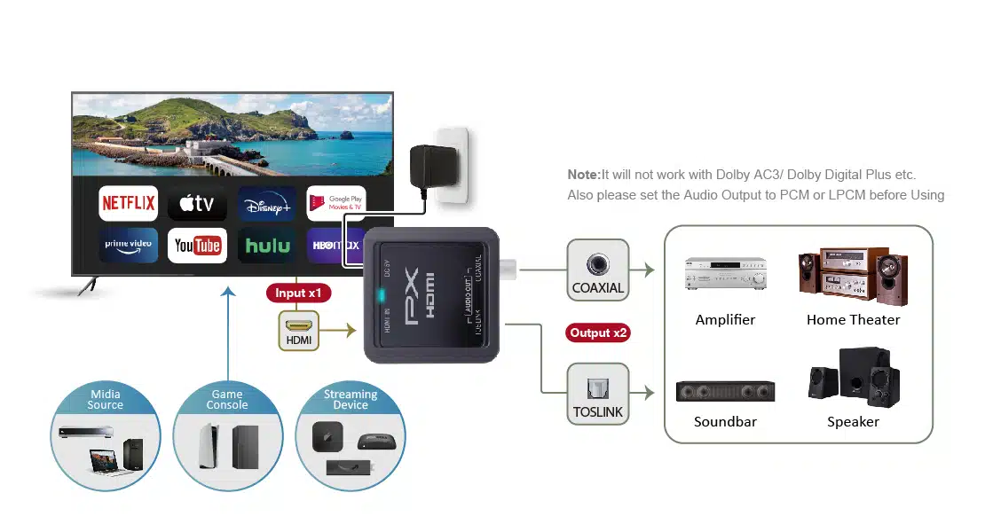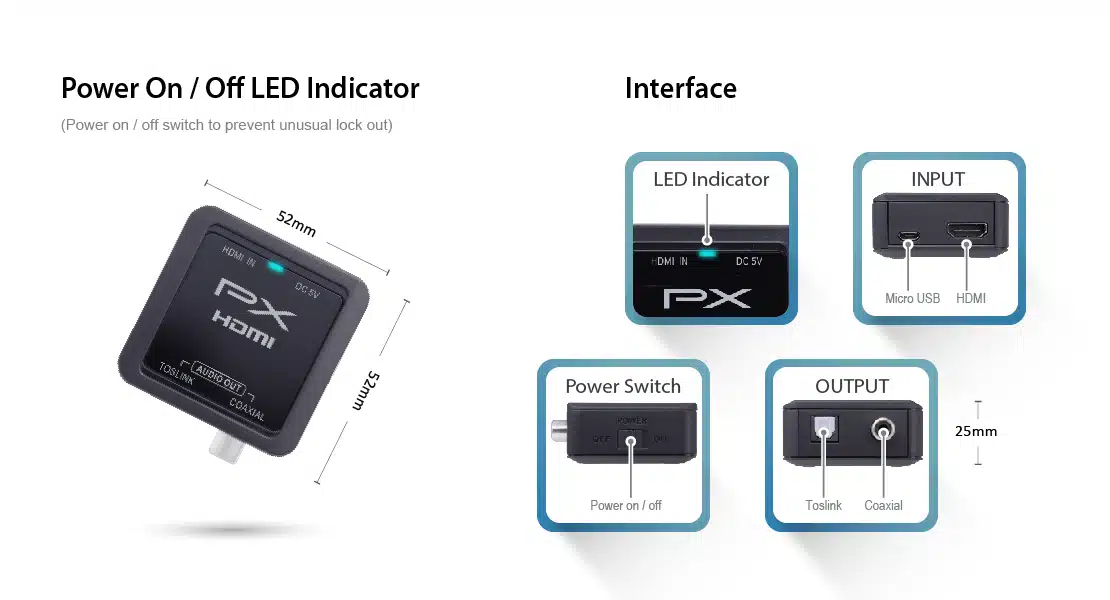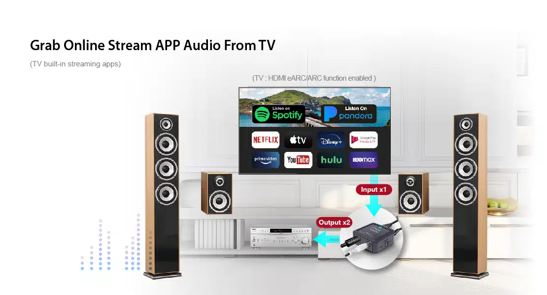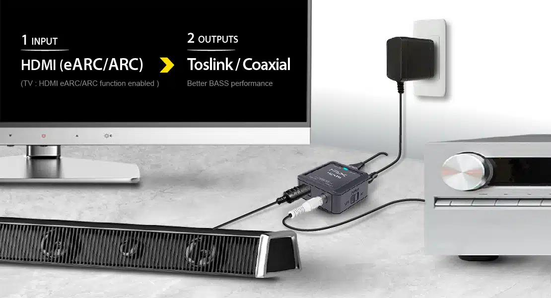 • Convert the audio signal from TV ARC / eARC source into digital audio output of Toslink (optical) and coaxial simultaneously.