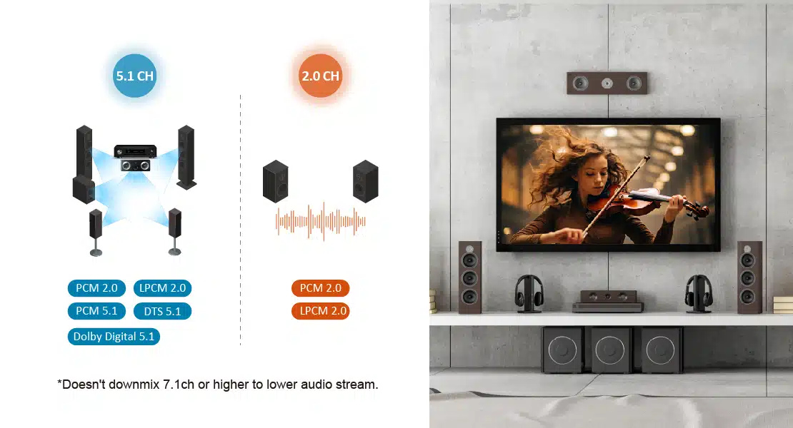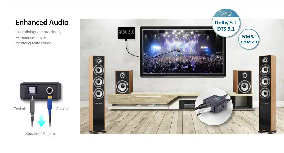 Many of today’s new televisions are smart TVs with built-in media streaming capability or lack of other audio outputs. This eDAC-200S HDMI audio converter is the simplest and budget friendly solution for sending audio from an ARC-enabled TV to an external audio system for 5.1 surrounding sounds.