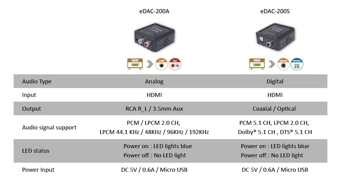 The eDAC-200S is an HDMI eARC / ARC audio extractor that converts signals from eARC / ARC of TV set to digital audio signals. It has one HDMI input and two digital audio outputs, one Toslink and the other coaxial. This converter supports stereo LPCM 2.0, Dolby®5.1, DTS®5.1, and has a LED indicator light.